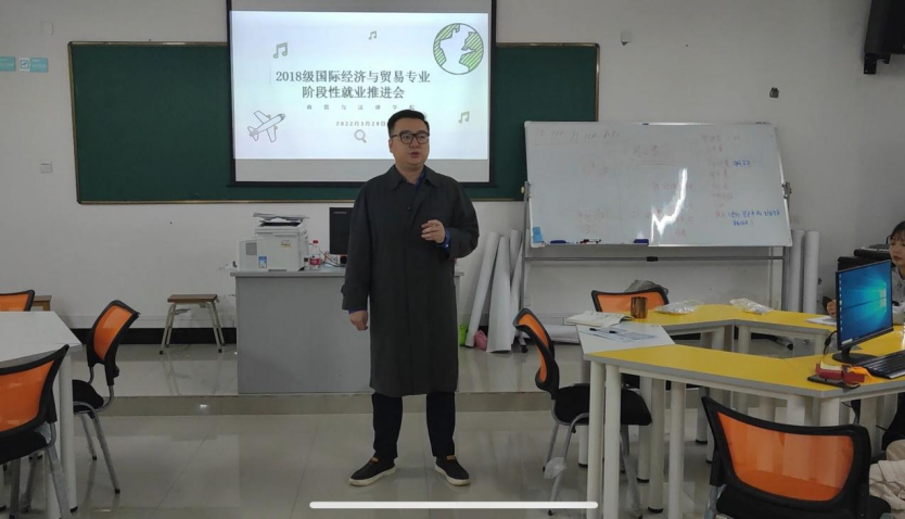 学院党总支书记、国际经济与贸易专业辅导员陈俊杰老师围绕春季就业工作的黄金期,结合4月份就业环境、毕业生简历调整及就业信息获取等方面出现的问题进行分析,并结合国贸专业毕业生的特点及就业区域给出相应的建议和意见。并围绕校外就业期间疫情防控、面试中防诈防骗和个人安全等问题做了具体的要求和布置。