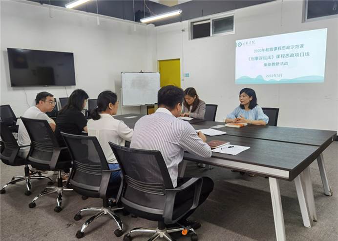 为深入推进“课程思政”教育教学改革,落实立德树人的根本任务,5月30日校级课程思政示范课《刑事诉讼法》课程组在商贸与法律学院办公室举行集体教研活动,课程建设负责人罗晓萌、成员林驰、蒋毅、钟林林、王晨以及法学教研室黄维娜老师参加本次活动。