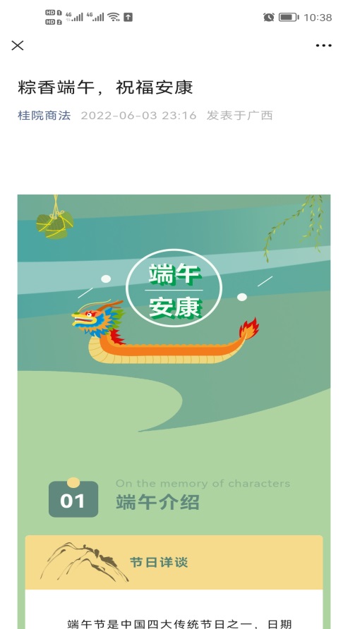 利用微信公众号“桂院商法”发布题为《粽香端午,祝福安康》的推文。通过推文介绍端午节的由来、习俗和意义,加强端午节节日知识的普及,展示节日文化内涵。
