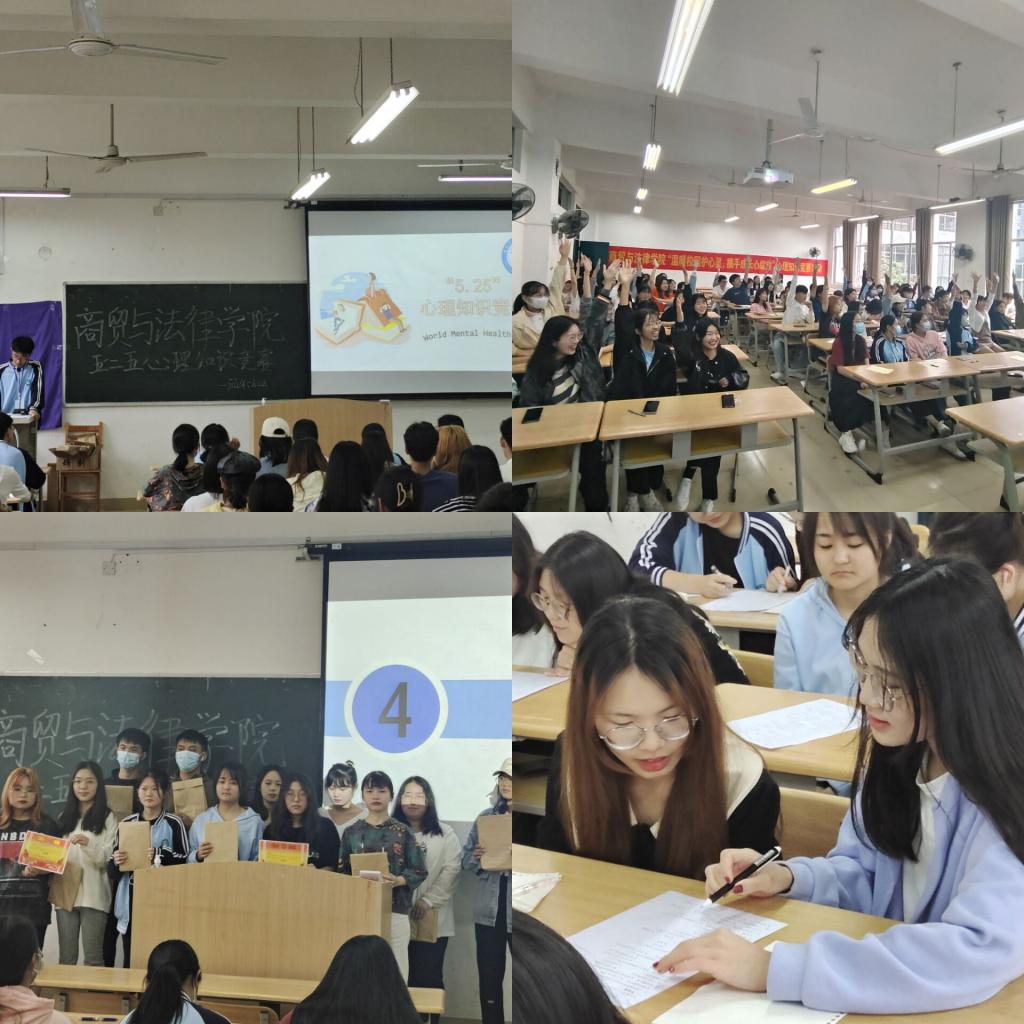 为了引导学生树立团结友爱、互帮互助、携手共进的意识,培养学生自尊自信、理性平和、积极向上的健康心态,5月22日,商贸与法律学院举行“5.25”心理健康知识竞赛,考验19支参赛队伍对心理知识的掌握程度和对健康心理状态的判断能力。竞赛分为必答题、抢答题和押分挑战三个环节,按照积分高低进行排名。在第一环节中,选手们配合默契,互相讨论,遇到难题沉着冷静,各队伍比分不分上下。抢答环节将整场比赛推到了高潮,主持人说出题目后倒数“三二一”,随即参赛选手们争先恐后举手抢答,赛事愈演愈烈。在押题环节,领先队伍互不示弱,勇于挑战,以稳定发挥战胜对手,引得其他队伍惊叹欢呼。经过精彩的角逐,“争先队”获一等奖;“畅通无组”“咚咚锵队”获二等奖;“重案六组”“惊蛰队”“啊对对队”获三等奖。2021级国际经济与贸易专业邓文榕说:“通过此次比赛,我明白了要保持一个健康的心态,树立正确的心理健康观,正确把握心灵的准绳,学会自我调节和适应,成为一名心理健康、生活快乐的大学生。”