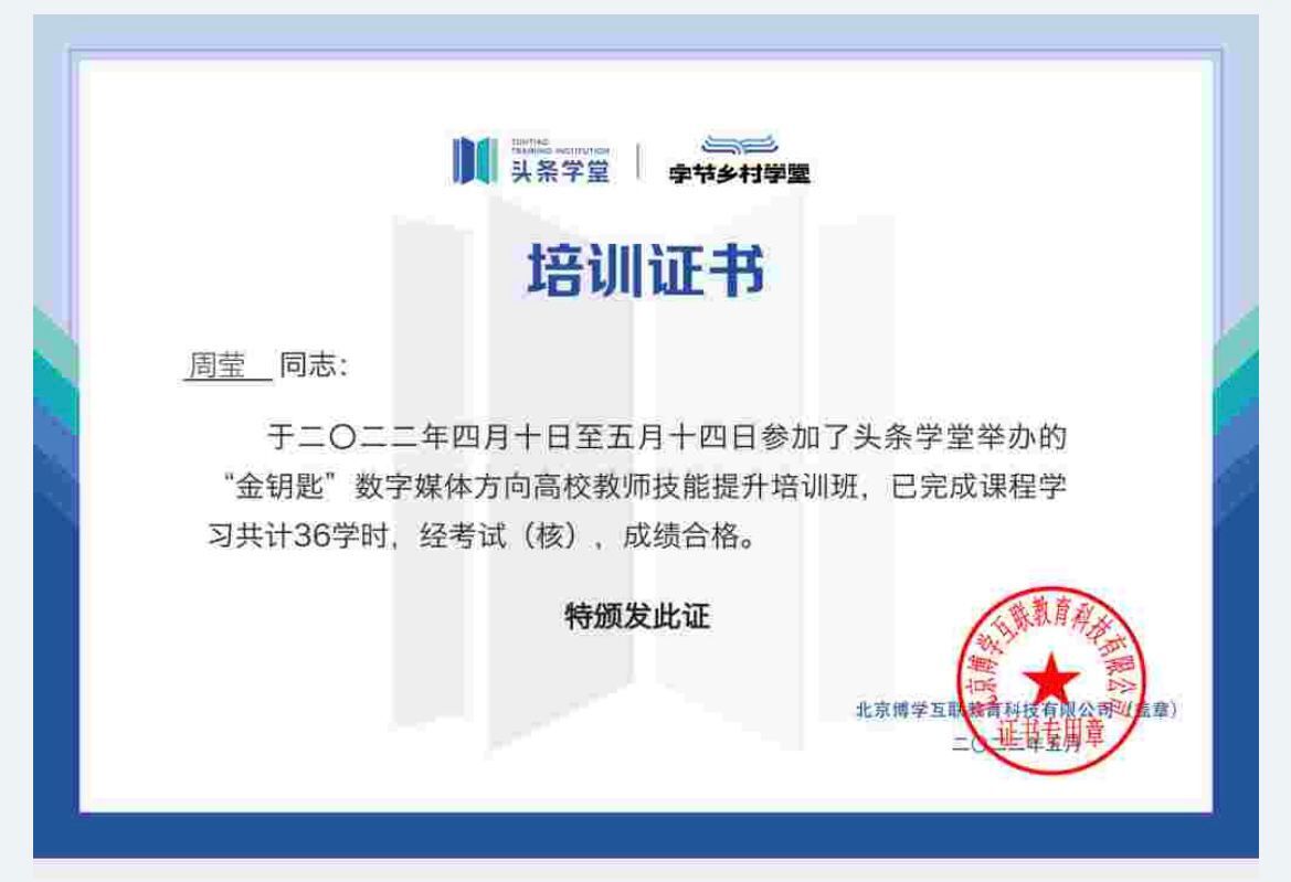 在4月份组织的公益师资培训中,电商与跨境贸易教研室申茜、张欣、周莹、刘美珍、刘雨婷等五位专任教师参加了由北京字节跳动科技有限公司组织的自媒体运营职业技能培训。