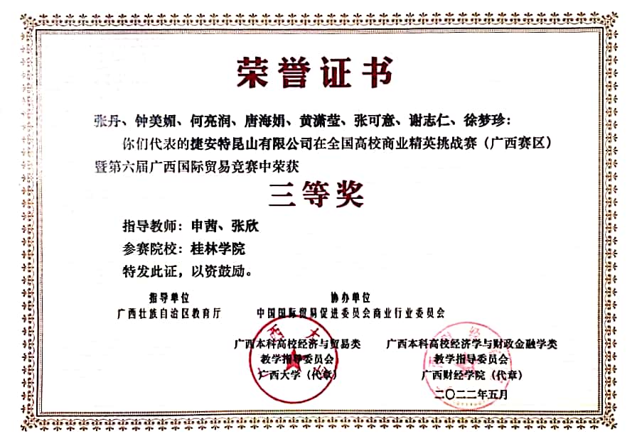 在4月20-23日举行的第六届广西区国际贸易专业技能大赛中,我院派出两支代表队参赛,由国际经济与贸易专业与电子商务专业学生组成,商法学院申茜、张欣老师指导的竞赛团队荣获三等奖。桂林学院获优秀组织奖!在本次比赛中,我校代表队展示了极高的专业水平。其中,捷安特昆山有限公司新产品发布会获得了评委的一致好评。