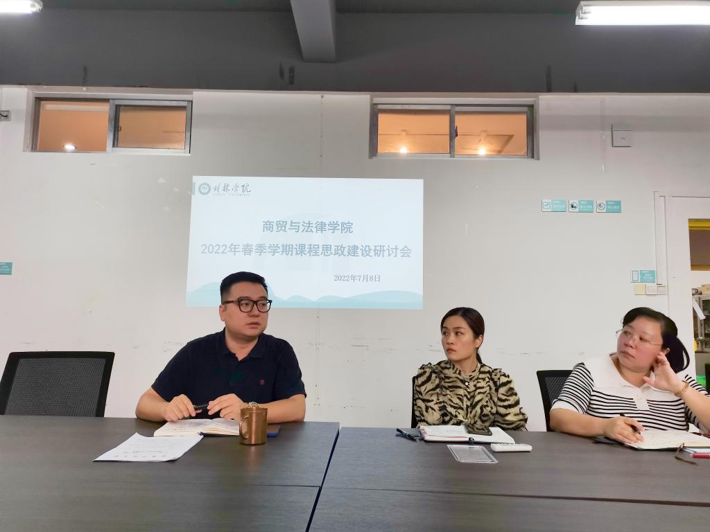 为认真贯彻落实习近平总书记在全国高校思想政治教师座谈会上的讲话精神,深化课程思政教学改革,7月8日下午,商贸与法律学院在3207教室成功召开2022年课程思政微课研讨会,会议由党总支书记陈俊杰主持,学院全体教师参会。