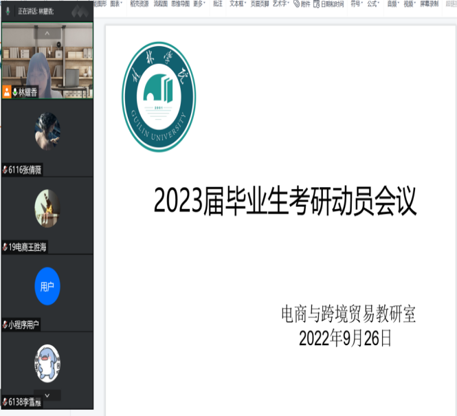 2023年硕士研究生入学考试已进入百日倒计时,为积极引导我院同学们进行考研复习,提升学生考研积极性,给考研学子答疑解惑。在学院领导高度重视、及时部署下,电商与跨境贸易教研室于9月26日再次召集2019级国际经济与贸易专业与2019级电子商务专业同学进行考研动员线上会议。