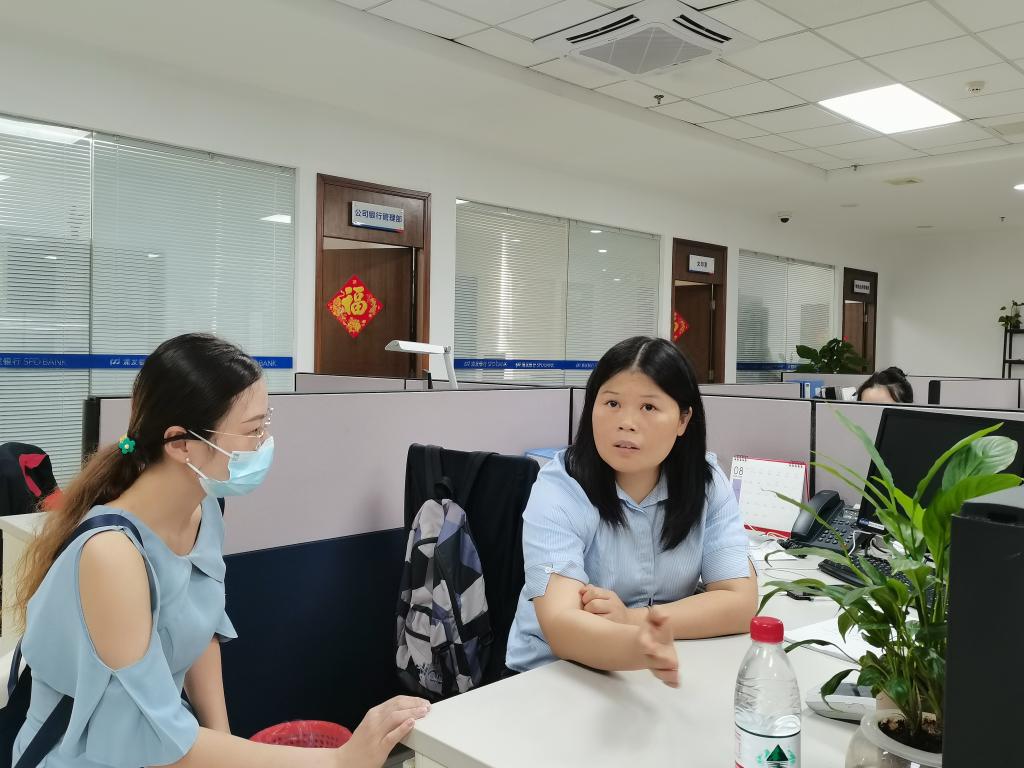 为了解2019级实习生工作生活情况和实习成效,进一步加强实习管理,8月16日,国际经济与贸易专业实习指导教师傅秋月前往桂林市浦发银行进行实习中期检查,与单位指导老师王经理进行深入交流。