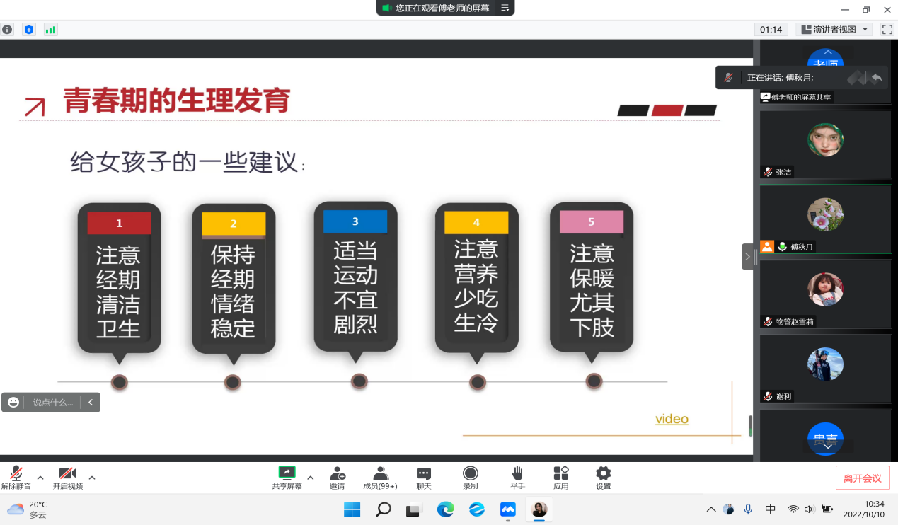 10月10日上午,由于疫情防控原因,商贸与法律学院在腾讯会议线上举行新生入学教育系列讲座之《女生生理卫生健康教育》讲座。讲座由商贸与法律学院傅秋月老师主讲,商贸与法律学院全体2022级女生参加本次讲座。