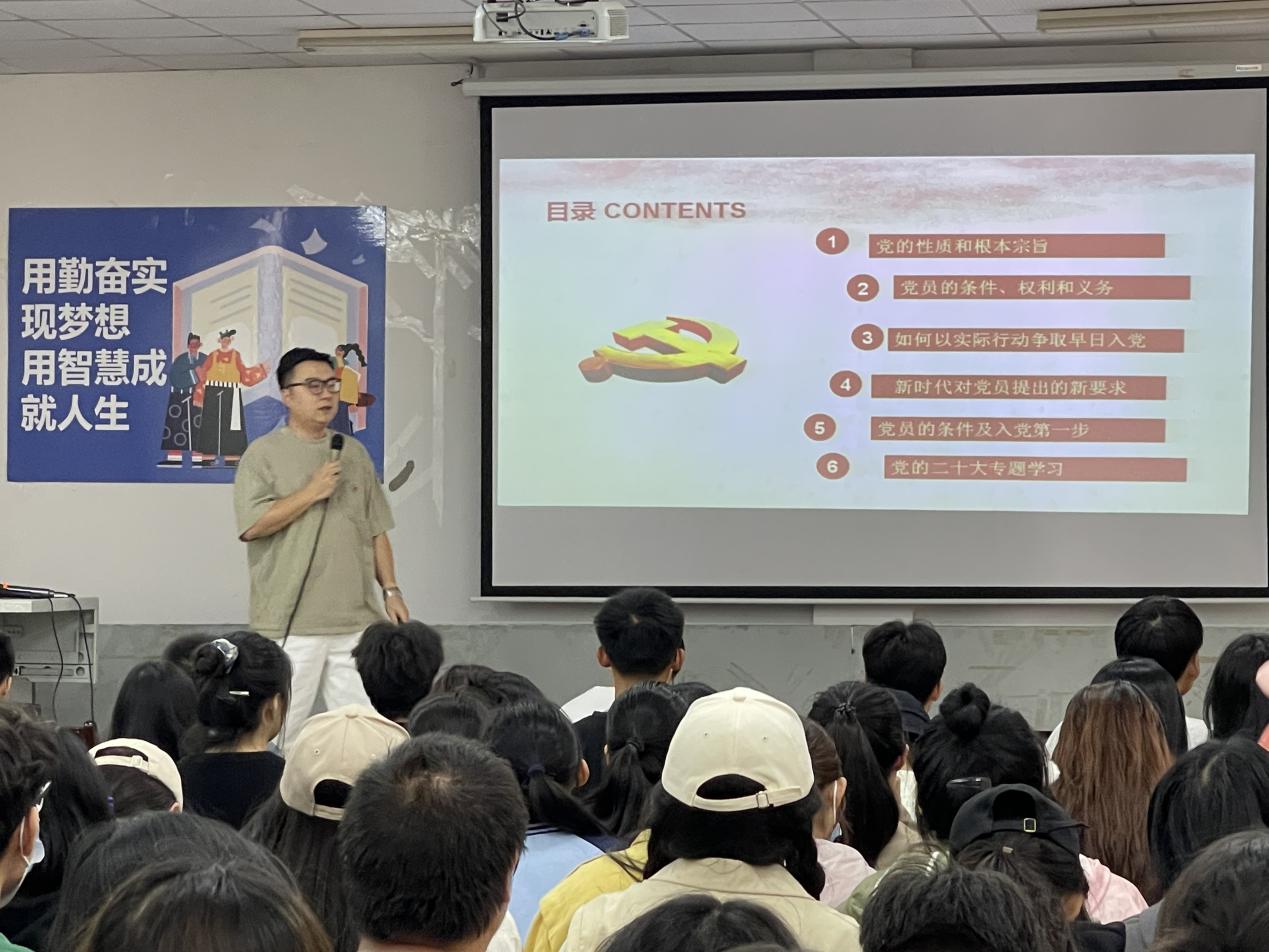 再次,陈俊杰老师向同学们围绕党员的权利与义务,向全体新生讲述了树立正确入党动机的重要性,强调大学生加入中国共产党的重要意义,鼓励新生积极向党组织靠拢,本着自愿和为国家付出的精神、坚定信念、接受党组织的培养教育及考察。
