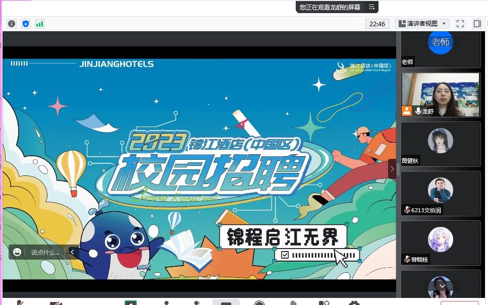 为贯彻落实党中央、国务院“稳就业”“保就业”决策部署,调动旅游管理类2023届毕业生就业积极性,11月8日下午,商贸与法律学院邀请了锦江酒店(中国区)人才发展部总监、校招负责人马壮宾为我们开展了酒店行业招聘宣讲会。本次宣讲会通过腾讯会议平台举行,毕业生辅导员傅秋月、2019级旅游管理类和2021级酒店管理专升本的全体学生参加了宣讲会。