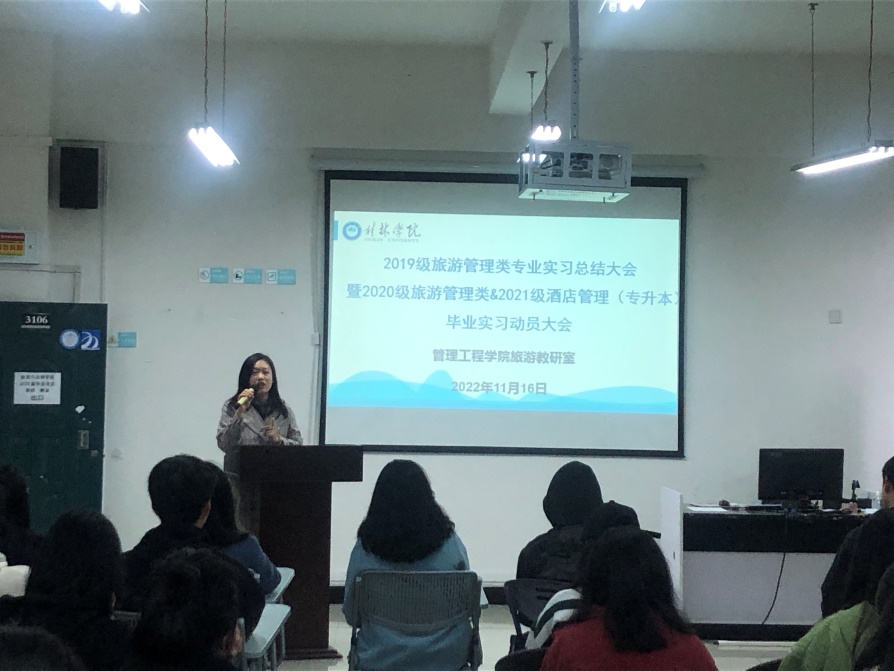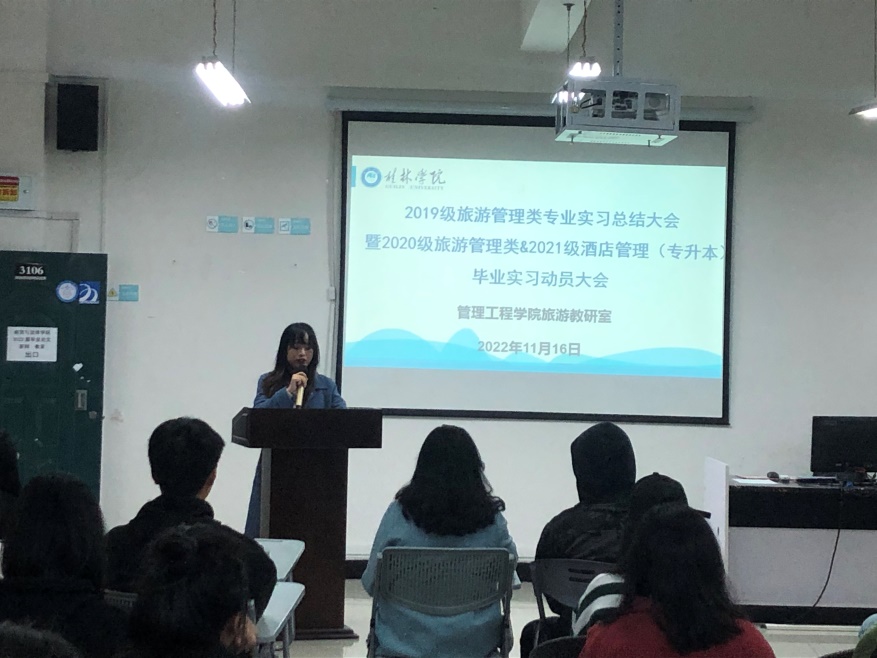 为鼓励我院学生积极参加实习,增强学生实践能力、培养学生提高分析问题和解决问题的能力,2022年11月16日中午,旅游管理教研室主任奉莹莹老师主持召开2019级旅游管理类专业实习总结会暨2020级旅游管理类、2021级酒店管理(专升本)专业实习动员大会,旅游管理教研室陈建文老师、刘莹莹老师、杨娜老师及刘小玲老师作为嘉宾出席本次活动。