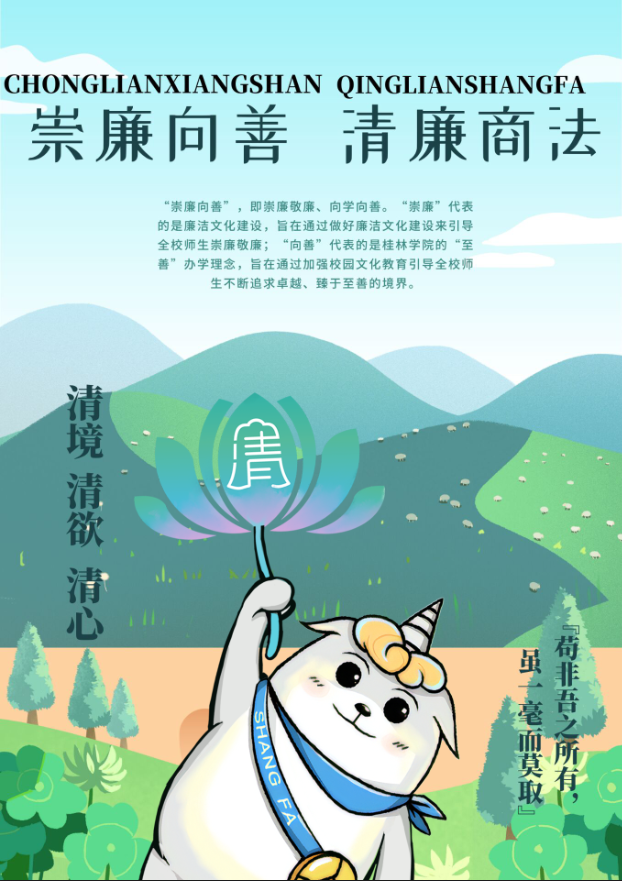 “崇廉向善”,即崇廉敬廉、向学向善。其中,“崇廉”代表的是廉洁文化建设,旨在通过做好廉洁文化建设来引导全校师生崇廉敬廉;“向善”代表的是桂林学院的“至善”办学理念,旨在通过加强校园文化教育引导全校师生不断追求卓越、臻于至善的境界。为助力推动“崇廉向善”文化的传播,5月23日——8月31日,我院通过举办文创大赛的形式,对学院的清廉文化标识或学院“法宝”进行文创开发,丰富学院廉洁文化内涵及专业文化特色,激励学生崇廉向善。