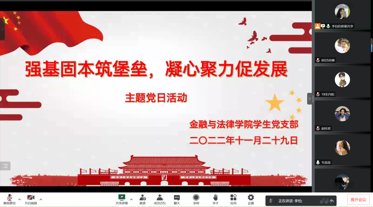 为深入贯彻基层党建“五基三化”攻坚年行动部署要求,推进基层党组织标准化规范化信息化建设,强化交流合作,提升党建工作整体水平。11月29日下午,金融与法律学院学生党支部在腾讯会议召开了“强基固本筑堡垒,凝心聚力促发展”主题党日活动。会议由预备党员李怡同志主持,参加本次会议的老师有金融与法律学院党总支副书记刘雪、学生党支部书记宋丹阳、团总支书记余晓丽、副书记魏晓珺和辅导员傅秋月、张美云以及全体党员,并邀请了理工学院学生党支部书记王少鹏参加本次会议。