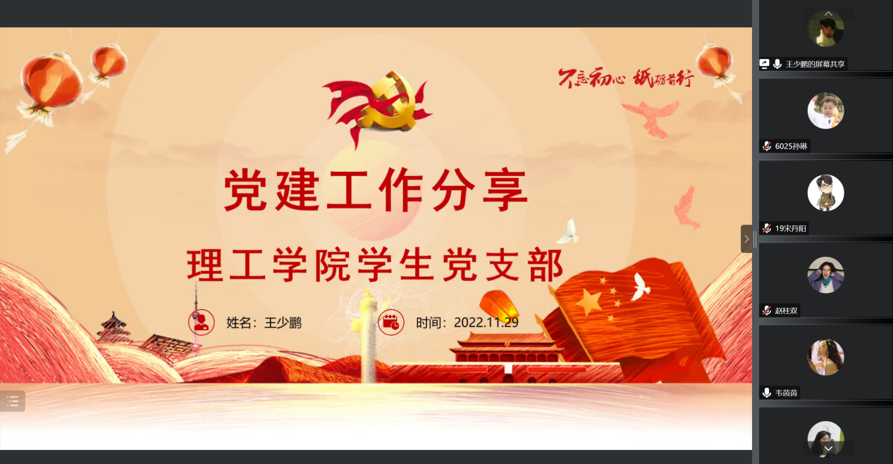 随后,理工学院学生党支部书记王少鹏老师分享了建设“五星级党支部”的工作经验,从围绕“近两年工作开展的情况”和“工作中存在的主要问题”两部分内容进行了党建工作的经验分享,这些宝贵的经验为我支部后续的党建工作开展提供了新思路、新方法。