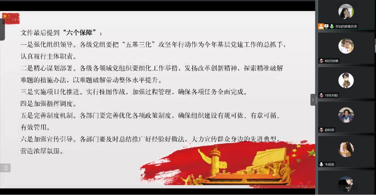 会议伊始,主持人李怡同志为大家解读《基层党建“五基三化”攻坚年行动方案》文件,解释了“五基三化”基本内涵和“六个保障”基本要求,并展示了我支部党员在学校疫情管理下充分发挥党员先锋作用助力疫情防控工作的优秀精神风貌。