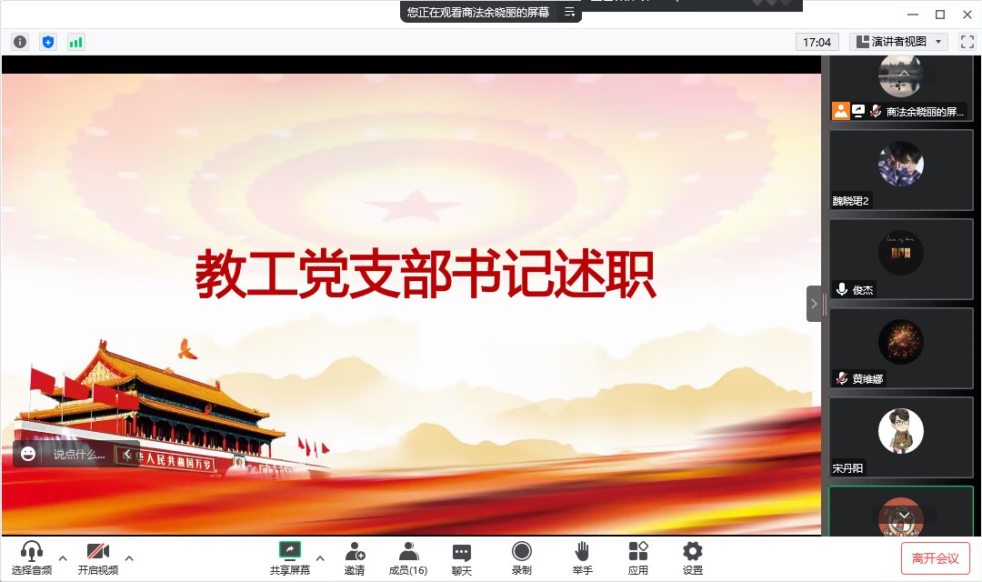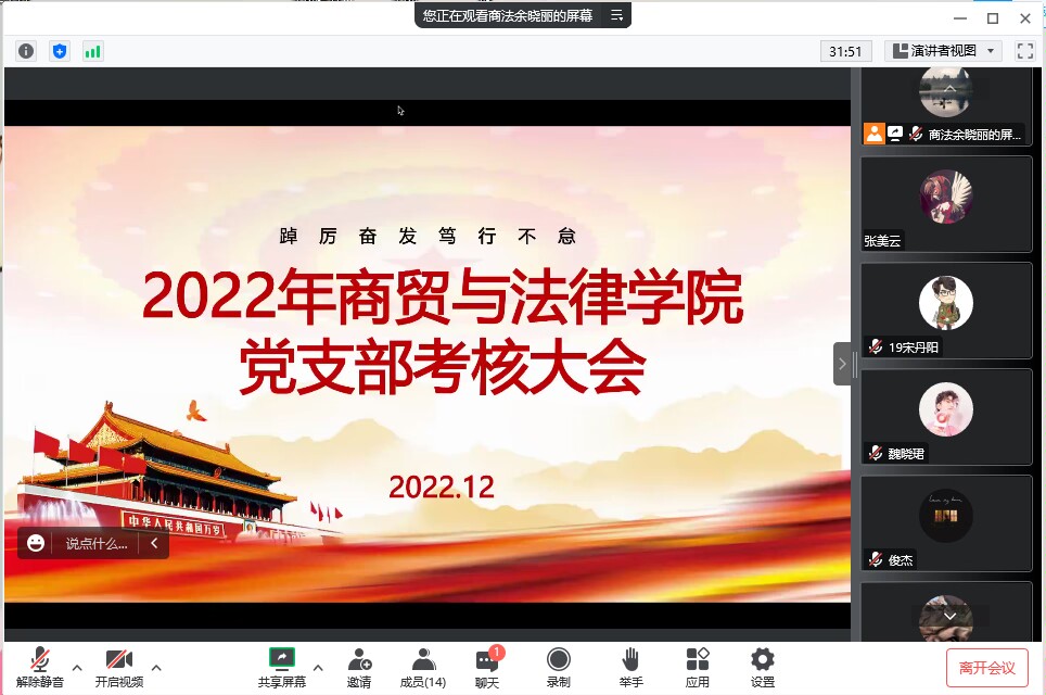 为深入学习贯彻落实习近平新时代中国特色社会主义思想和党的二十大精神,进一步落实全面从严治党要求,12月23日下午,商贸与法律学院党总支通过腾讯会议召开2022年党支部考核大会,全体党总支委员、部分教师党员及学生党员代表参加了会议,会议由党总支宣传委员余晓丽主持。
