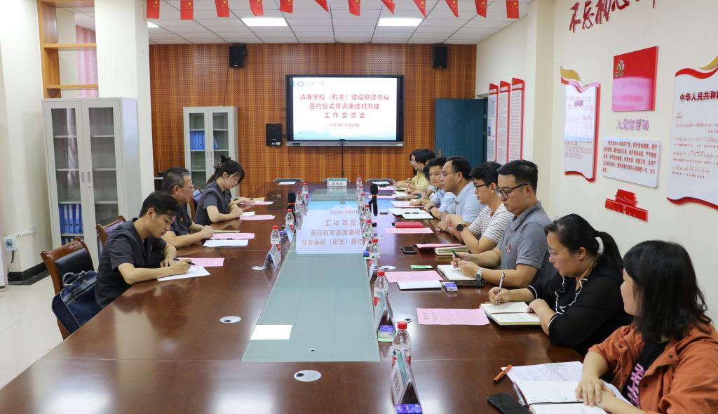 为持续深化和推进清廉学校(机关)建设,10月26日下午,我校与桂林市雁山区人民法院在8312会议室举行了清廉学校(机关)建设联建协议签约仪式暨清廉结对共建工作交流会。校党委副书记、纪委书记、副校长邓志平,桂林市雁山区人民法院党组书记、院长刘红星,桂林市雁山区人民法院政治部主任、党支部书记廖婷及相关法官代表,学校党政事务部、语言文学学院、商贸与法律学院相关负责人及教师代表参加了本次活动,仪式由邓志平主持。