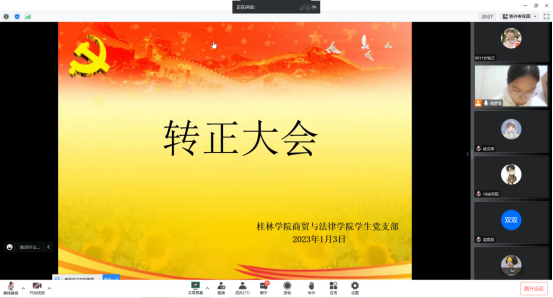 为进一步加强基层党组织建设,落实学生党员发展工作,1月3日晚上,金融与法律学院学生党支部通过线上的方式开展了本学期第二批预备党员转正大会。大会由陈梦雪同志主持,金融与法律学院党总支副书记刘雪老师、学生党支部书记宋丹阳老师、团总支书记余晓丽老师、团总支副书记魏晓珺老师、辅导员傅秋月和张美云老师以及支部全体党员参加本次会议。