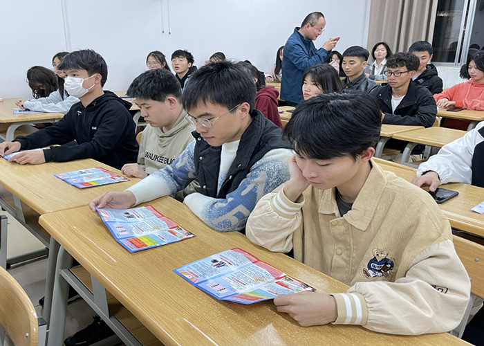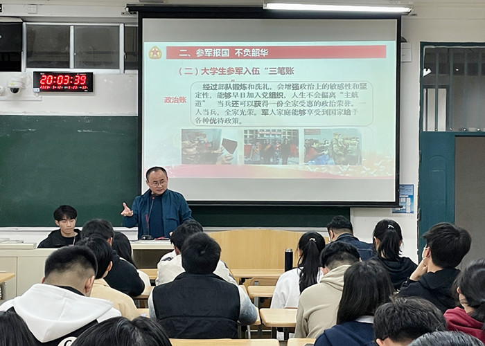 首先,党老师向同学们播放了征兵视频和宣传片,很大程度上增强了同学们的视觉冲击力,培养同学们的家国情怀。党老师从“入伍的九大好处”、“大学生参军入伍的三笔账”以及“优待政策”三个方面详细介绍了大学生入伍的意义,并向同学们介绍了入伍的基本条件、基本流程,动员符合条件要求的同学积极响应国家号召,参军入伍,争做明日英雄。