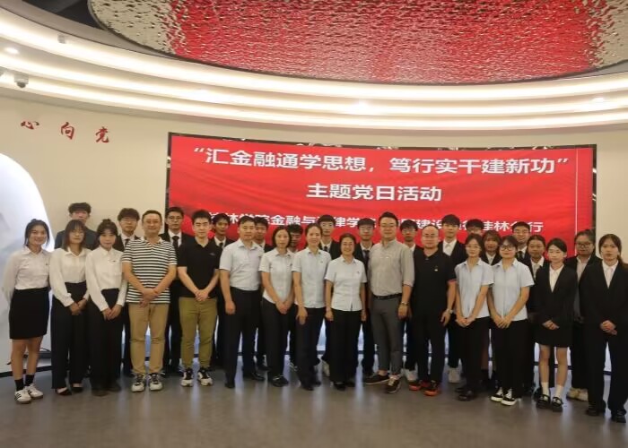 为深入学习习近平新时代中国特色社会主义思想,促进党建与专业实践相融合,深化校地合作,实现党建优势互学互补,10月25日下午,金融与法律学院党总支、金融与法律学院学生社区党支部、学院教工党支部联合中国建设银行桂林分行党委开展“汇金融通学思想,笃行实干建新功”主题党日活动。中国建设银行桂林分行党委组织部部长、总经理王唯、副总经理秦南茜、客户经理倪效鹏、金融与法律学院党总支书记陈俊杰、金融学教研室主任韦翔、副主任胡乐天、师生党支部党员代表及学院第五批金融实务班学子参加了此次主题党日活动。本次活动在中国建设银行桂林分行文明践行馆举行,由韦翔主持。