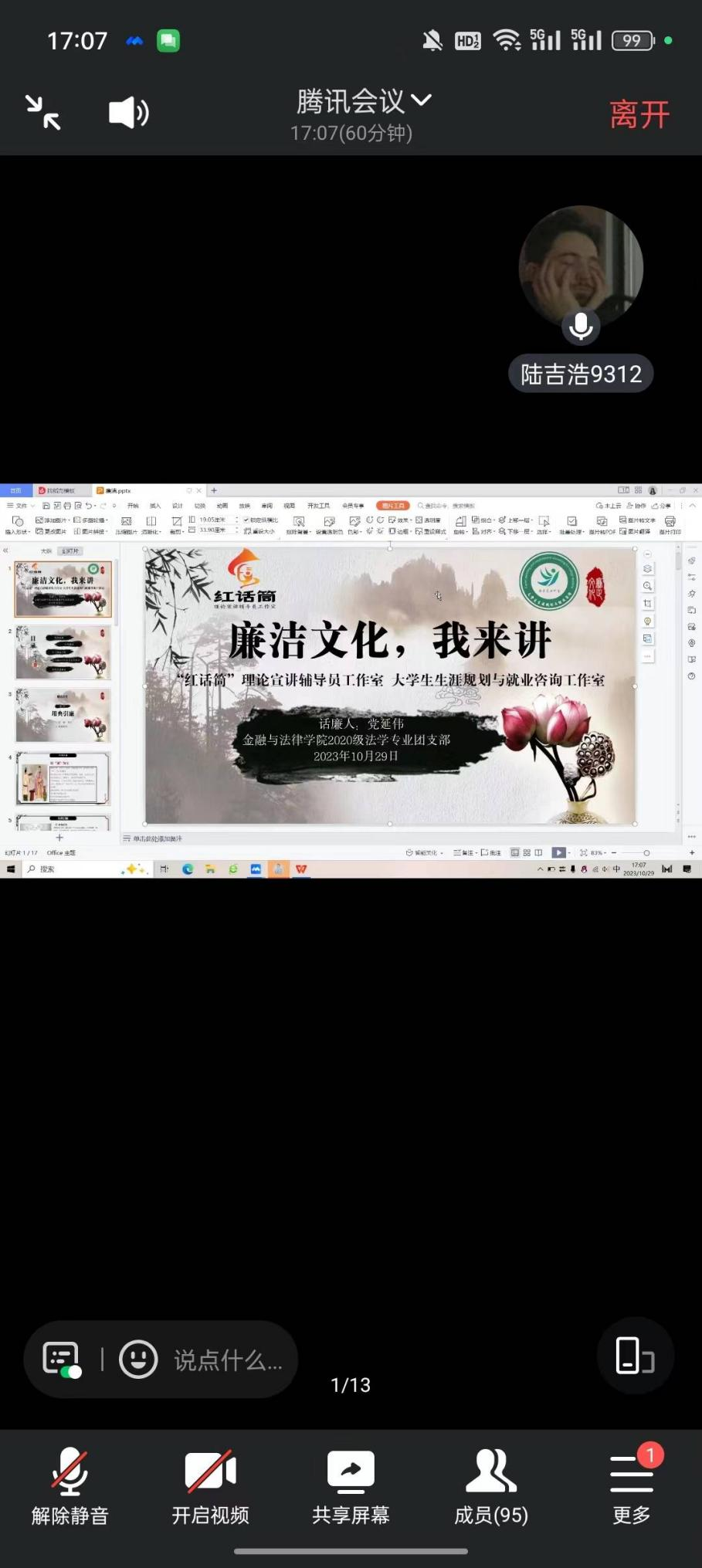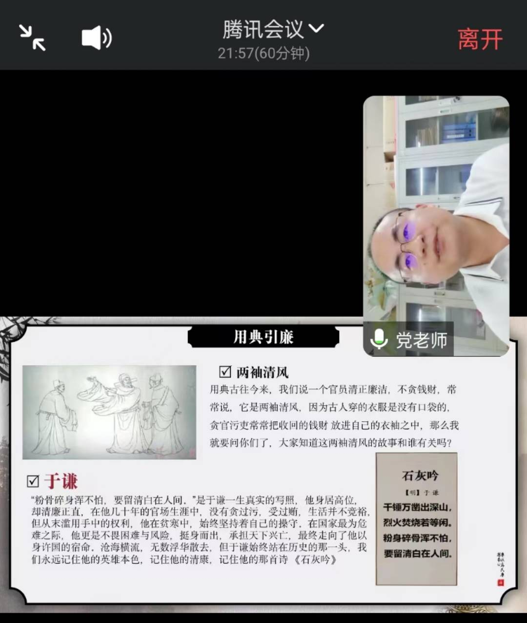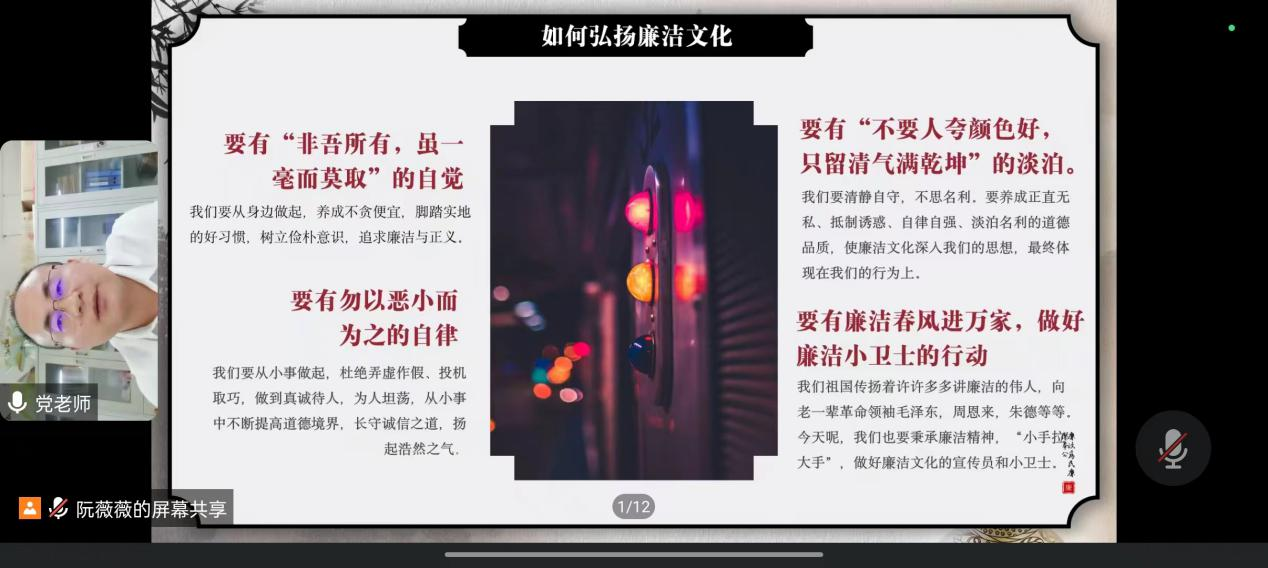 由于学生在校外实习,本次会议形式为线上会议。本次班会由辅导员党老师担任主持人,结合廉洁文化的来源、弘扬以及自己的经历等多角度给同学们普及了廉洁文化的重要性,为我们带来一场关于廉洁的精彩演讲。党老师一直以来都致力于培养学生的道德观念和价值观,他的演讲引领我们思考,激发我们对廉洁的认识和理解。 廉洁意味着廉洁自律,守住底线,不为诱惑所动摇。在学校生活中,我们要坚守诚信原则,不抄袭作业、不考试作弊,不以欺骗的手段谋取不正当的利益。廉洁也意味着明辨是非,秉持正义,不容忍不公正的行为。我们要公正对待他人,不进行诋毁、攻击、欺凌等恶意行为,要尊重他人的权益和尊严。