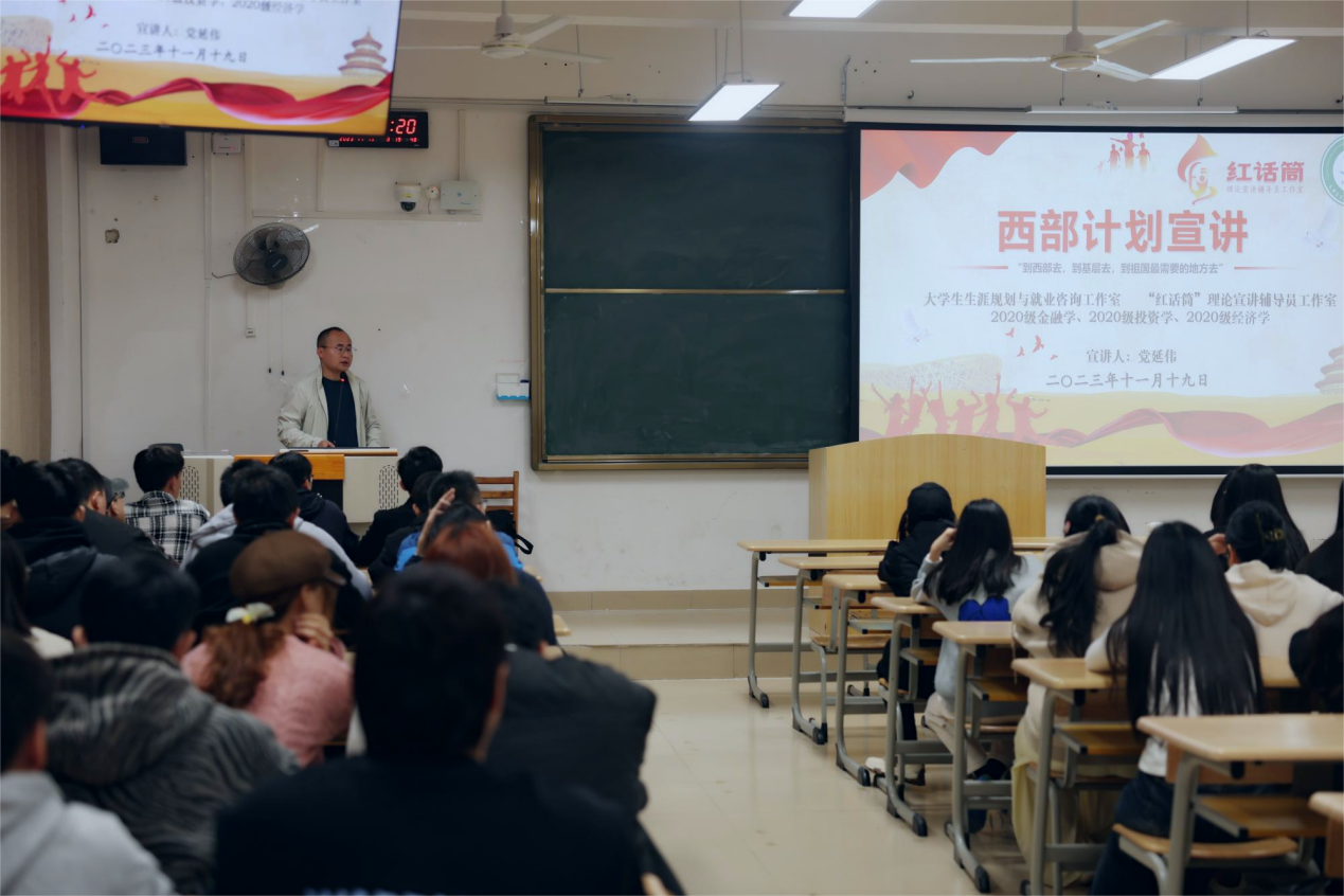 活动伊始,党延伟老师全面介绍了大学生志愿服务西部计划项目,并就西部计划志愿者招募选拔条件、报名时间及方式、相关政策支持等问题进行了全面且系统的讲解。在讲解政策的同时,也分享了许多参加西部计划、投入乡村教育、助力乡村振兴、服务基层管理的青春故事。随后,党老师重点解读了志愿项目参与者能够在考研、就业创业、职称评定等方面享受到的政策优惠,还详细介绍了志愿项目中的生活保障与政策保障,呼吁同学们积极投身到西部去,到基层去,到祖国最需要的地方去,播撒青春能量,以青春之光去照亮西部。