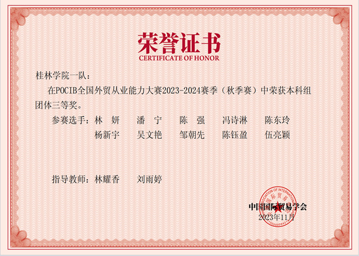 由中国国际贸易学会主办的第十三届POCIB全国外贸从业能力大赛(秋季赛)于11月14日上午10时顺利结束。在学院国际经济与贸易专业教研室积极推动下,共组建2支队伍参加此次比赛。在长达13天马拉松式的赛程中,各参赛选手顽强拼搏,持续奋战在数字贸易B2B模块和POCIB实训“战场”,实现交易共计189笔。11月29日,竞赛结果揭晓,我院取得2组全国“团体三等奖”,国贸专业林妍、潘宁及陈强3名同学获得全项优秀的优秀成绩。