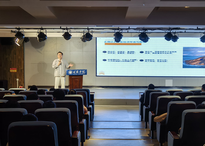 会上,陈俊杰从过渡期管理、就业环境分析、经济周期对专业影响、就业技巧及建议四方面发言。他对2024届就业形势和相关政策进行解读,提出在新时代的背景下,提醒在场毕业生要更积极主动地思考,适当转换求职目的,调整心态,改变“学生气”形象,以“职业人”心态求职。陈俊杰建议同学们:做抓住机会窗口的有心人;结合家庭实际情况、个人兴趣和专长选择就业城市和岗位;做好同理心,站在用人单位的实际需求来考虑求职工作;充分发挥个人资源在求职中的正向作用;端正心态,树立合理目标,沉着应对,对标行业标准。活动最后,党延伟告诫同学们要懂得换位思考,高回报需要多付出,当下最重要的是提升自身价值,也祝福在场所有的同学在求职路上都是幸运儿,都能够找到心仪的工作!