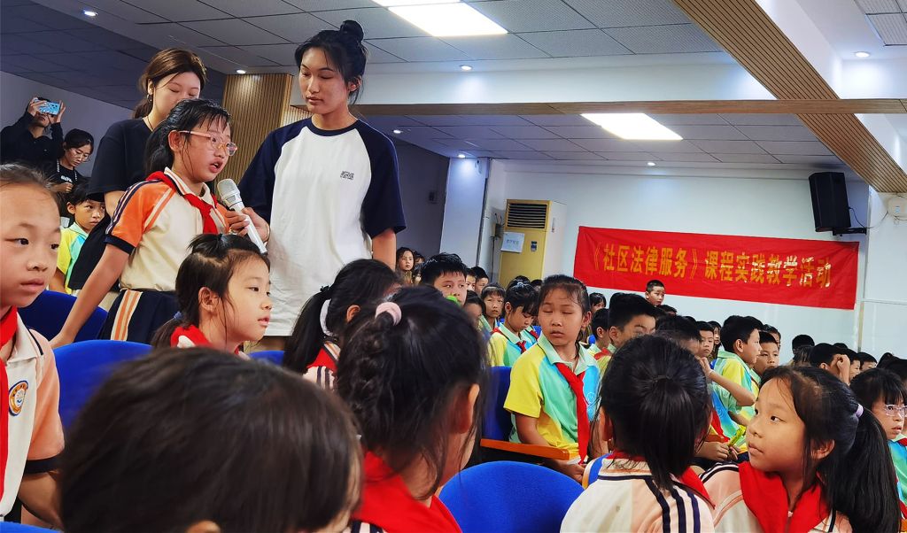 活动中,主讲老师秦川以真实案例、角色扮演等生动活泼的方式,讲解了校园欺凌的表现、危害、应对与预防。“小朋友们,你们知道什么是校园欺凌吗?” “遇到欺凌应该怎么办?”对于现场提出的每一个问题,小朋友们踊跃发言、各抒己见。《社区法律服务》课程实践活动的大学生志愿者也积极参与其中,现场解答小朋友们在学校里遇到的各种问题,普及法律常识。在热烈的普法氛围中,引导孩子们学法、懂法、守法、用法,拒绝校园欺凌,保护自己的合法权益。