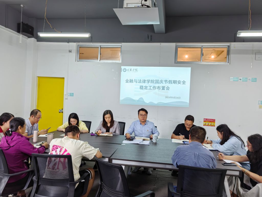 9月25日下午,金融与法律学院在至善楼3207教室召开国庆节假期安全稳定工作布置会。会议旨在深入传达学校安全稳定工作会议精神,明确国庆节期间的安全纪律要求,并对假期前后的各项工作进行详细部署,为假期的安全稳定工作打下坚实基础。学院领导班子全体成员、各教研室主任、全体专职辅导员及实验实训管理专员参加本次会议,会议由学院党总支书记主持。