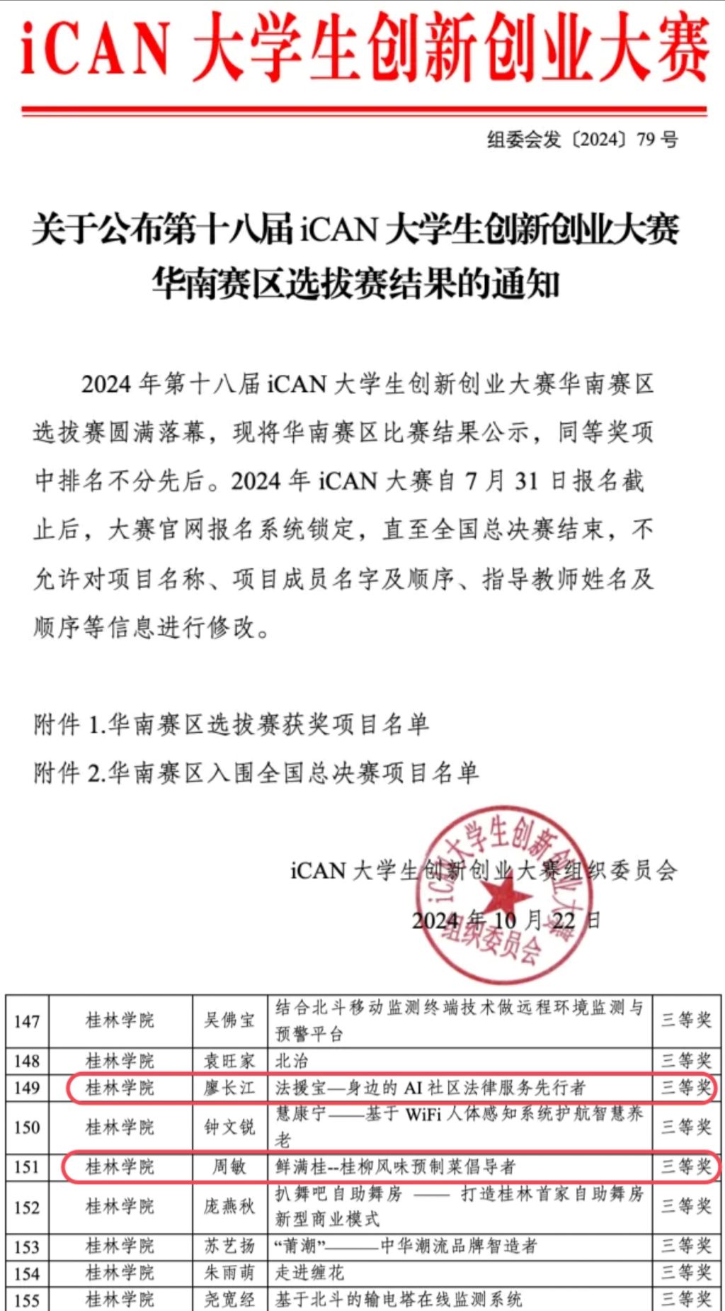 近日,第十八届iCAN大学生创新创业大赛华南区选拔赛决赛在广州城市理工学院落下帷幕,金融与法律学院的《法援宝-身边的AI社区法律服务先行者》《鲜满桂-桂林风味预制菜倡导者》项目团队凭借卓越的创意与扎实的专业功底,首次参加该项赛事并斩获三等奖2项。