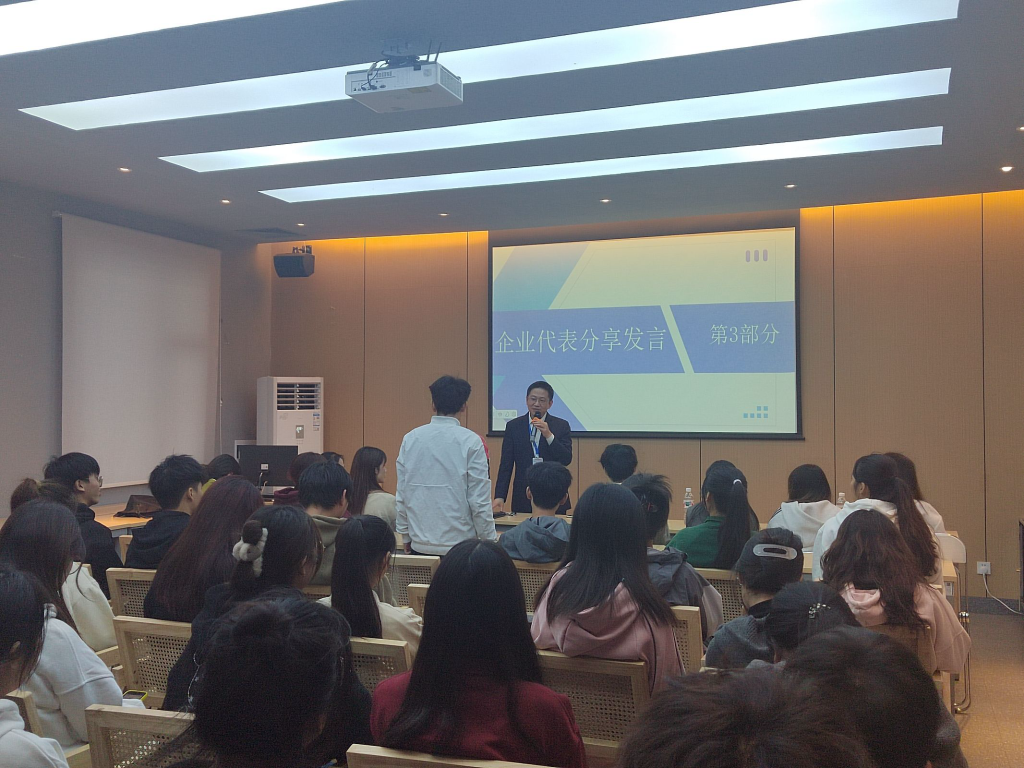 紧接着,企业代表杨行长从企业角度出发,结合自身的大学经历与面试成功经验,为同学们分享了如何度过大学生活以及提前做好人生规划的建议。同时,凭借多年的人力资源经验,他指出:“在招聘过程中,企业不仅看重应聘者的学习绩点,更关注其临场应答能力、团队合作精神以及组织协调能力。”为了让学生更直观地感受面试氛围,杨行长还现场组织了面试模拟环节,考验学生的应变能力,并引导学生深入思考自身优势和不足。