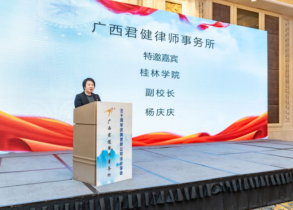 11月23日下午,广西君健律师事务所成立三十周年庆典暨新《中华人民共和国公司法》分享会在桂林香格里拉大酒店隆重举行。副校长杨庆庆应邀出席此次盛会并致辞,金融与法律学院院长、应用法学教研室主任参加了会议。