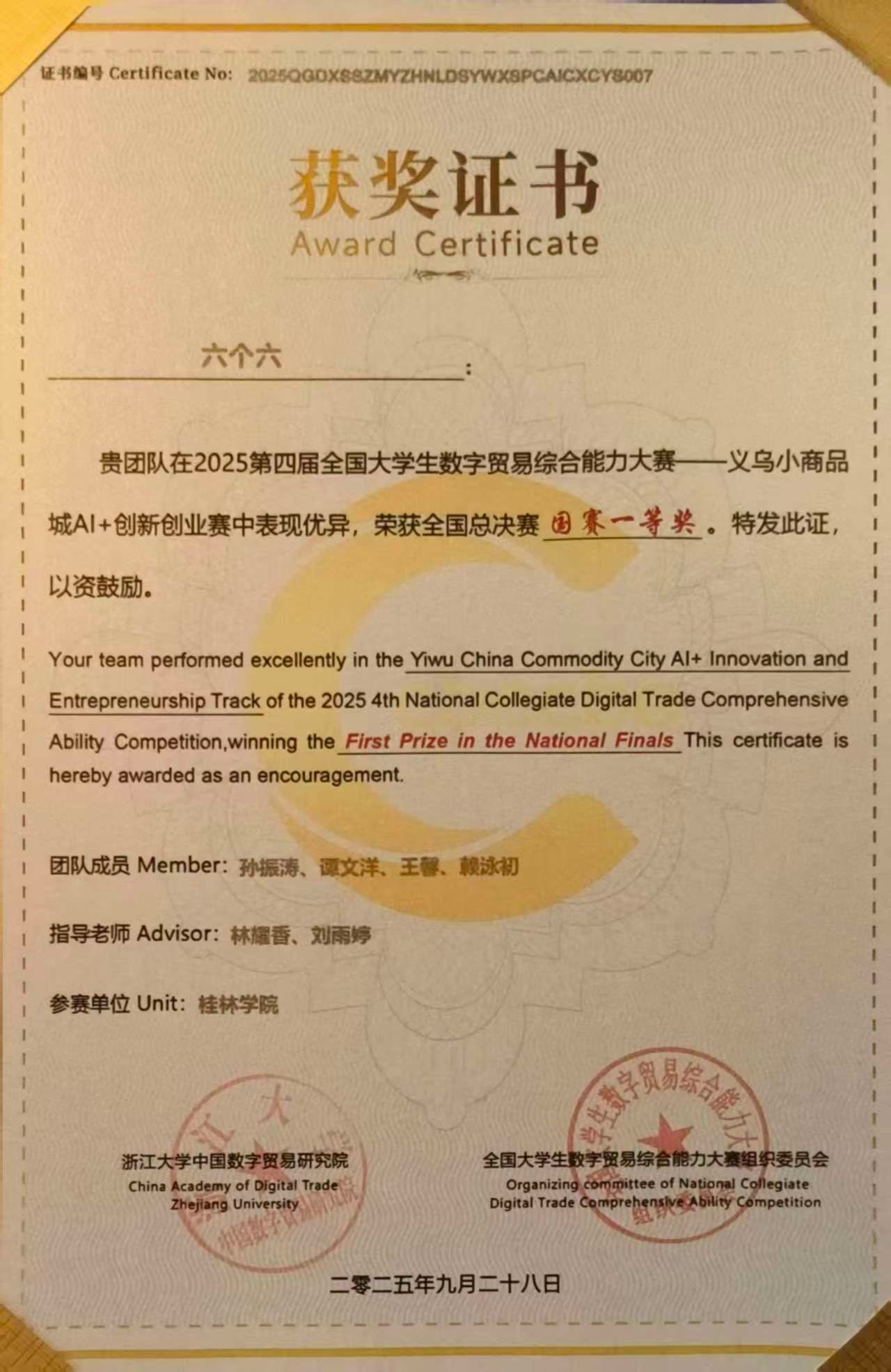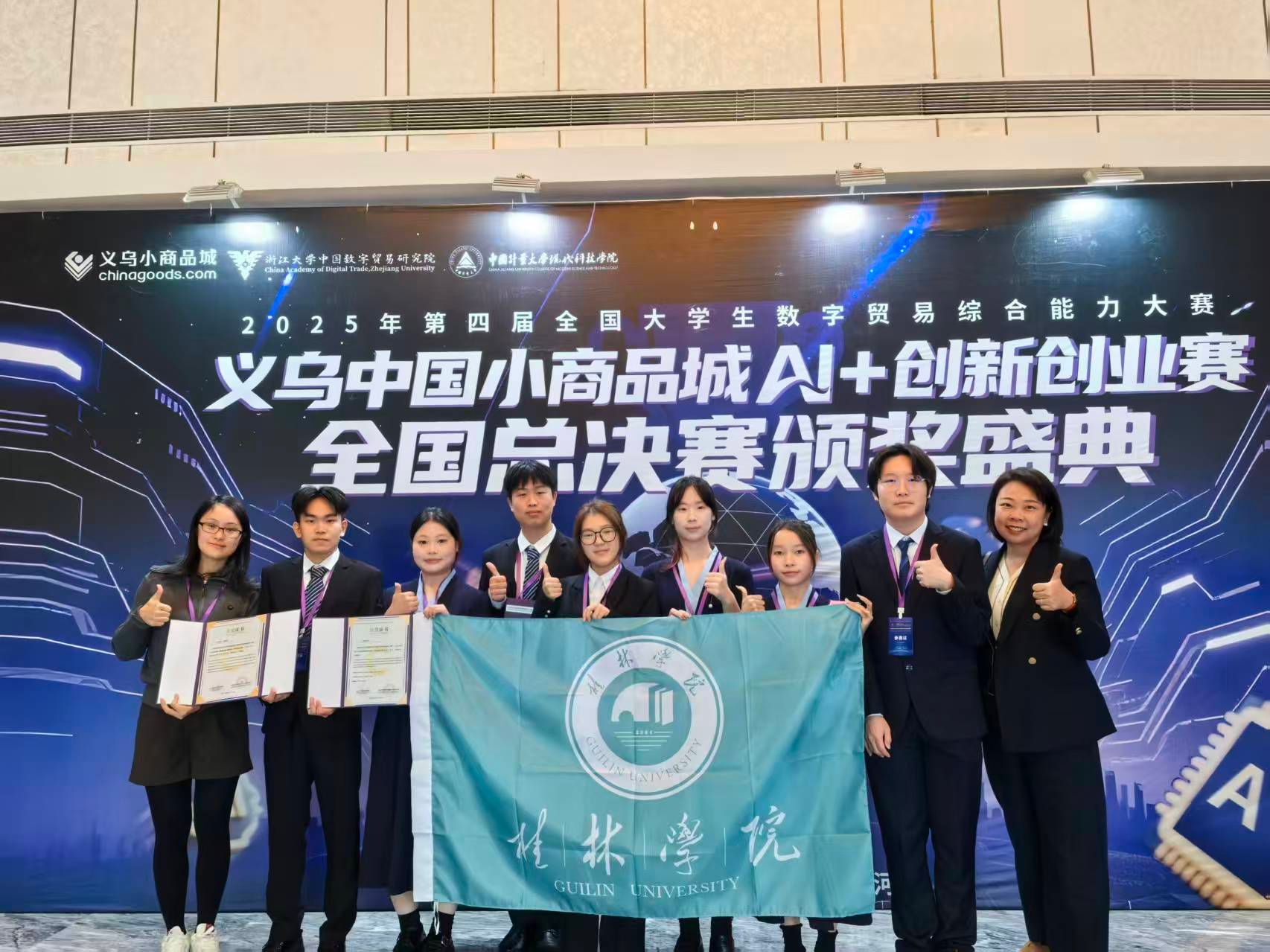 10月24日,2025年第四届全国大学生数字贸易综合能力大赛“义乌中国小商品城AI+创新创业赛”全国总决赛在浙江义乌圆满落幕。我校学子在激烈竞争中脱颖而出,派出的两支队伍从全国309所高校的2279支参赛团队中一路闯关,经过100多天的努力拼搏最终斩获全国一等奖1项、全国二等奖1项——其中国际经济与贸易专业团队摘得全国一等奖,电子商务专业团队荣获全国二等奖,充分彰显了学校在数字贸易领域人才培养的扎实实力。