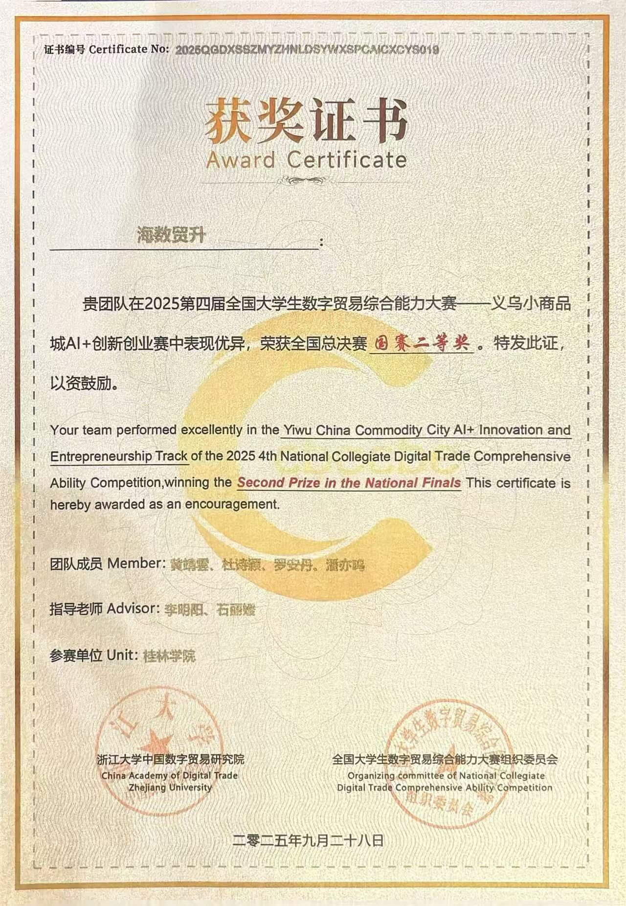 此次获奖是学子们积极拼搏、勇于实践的成果,更印证了学校“产教融合、以赛促学”人才培养理念的有效性。学校长期围绕数字贸易产业需求优化课程体系,加强实践教学,为学生搭建了提升专业能力的良好平台。未来,学校将继续深化与数字贸易领域产业资源的合作,持续培养适应行业发展的高素质人才,为区域数字经济高质量发展注入动力。