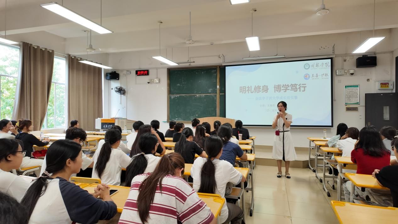 为进一步培育2025级新生的文明礼仪意识,为学子们厘清大学成长的“底线”与“方向”,10月15日下午,金融与法律学院在1316教室开展主题为“明礼修身 博学笃行——金法学子大学成长双引擎”的专题讲座。本次讲座特邀请王海玲副教授讲授,学院2025级全体新生参加此次讲座。
