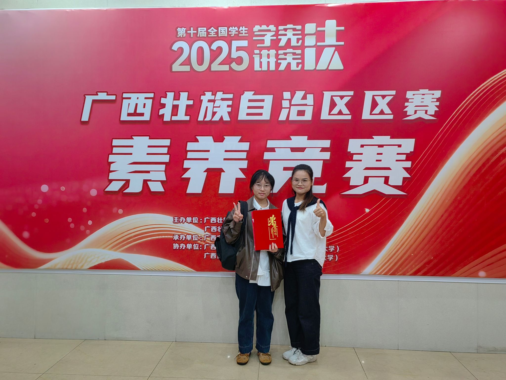 据悉,本次素养竞赛是广西“学宪法 讲宪法”系列活动的核心环节,旨在深化全区学生对宪法的学习理解,弘扬宪法精神,培育法治信仰。自接到参赛通知以来,金融与法律学院高度重视,备赛期间,李雪莲同学系统梳理宪法理论知识,深入研读法治政策文件,反复打磨现场表达技巧,为竞赛做好充分准备。决赛中,她在笔试环节精准作答,展现了扎实的知识储备;现场竞赛环节,面对评委提问沉着应对,结合法学专业视角阐释宪法意义,逻辑严谨、观点鲜明,赢得了评委的认可。