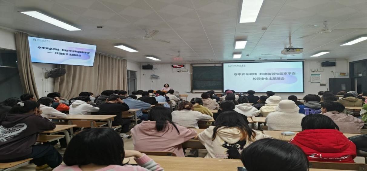 为进一步增强全院学生的安全意识,普及安全知识,提升应对各类风险的能力,共同营造安全、稳定、和谐的校园环境,11月23日,金融与法律学院成功开展了以“守牢安全底线 共建和谐校园享平安”为主题的系列安全教育班会。班会内容紧扣学生日常生活实际,聚焦宿舍安全、消防安全、校园交通安全等重点领域,取得了良好的宣传教育效果。
