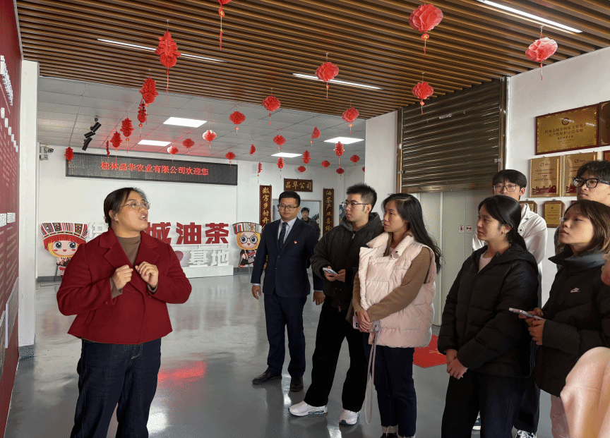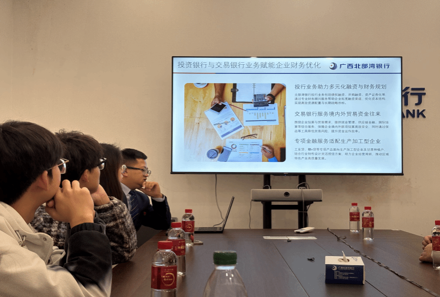 党建引领明方向,金融服务惠民生。活动首站,师生们来到广西北部湾银行恭城支行。支行行长杨行通为师生系统介绍了北部湾银行的金融服务与产品。通过柿子和油茶产业链金融等特色普惠信贷产品,银行将党组织的政治优势、组织优势转化为服务地方经济发展的实际成效,精准支持恭城特色农业的规模化、品牌化发展,展现了金融服务乡村振兴的责任担当。