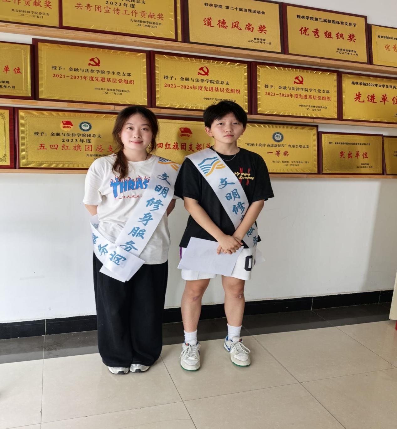 文明修身岗是一支由学生党员、入党积极分子、学生会成员及普通志愿者组成的服务队伍。志愿者们主要利用课前时间,在教学楼入口处开展文明劝导工作,针对带早餐进教室、穿拖鞋等不文明现象进行耐心提醒和引导。此外,文明修身岗还创新性地开展了“文明小贴士”宣传活动。志愿者们将文明标语制作成精美卡片,在学院楼梯、学院门口等地粘贴,用温馨的话语传递文明理念,向同学们普及文明行为背后的法律规范与道德准则,让文明修身不仅停留在行为表面,更深入到思想层面。