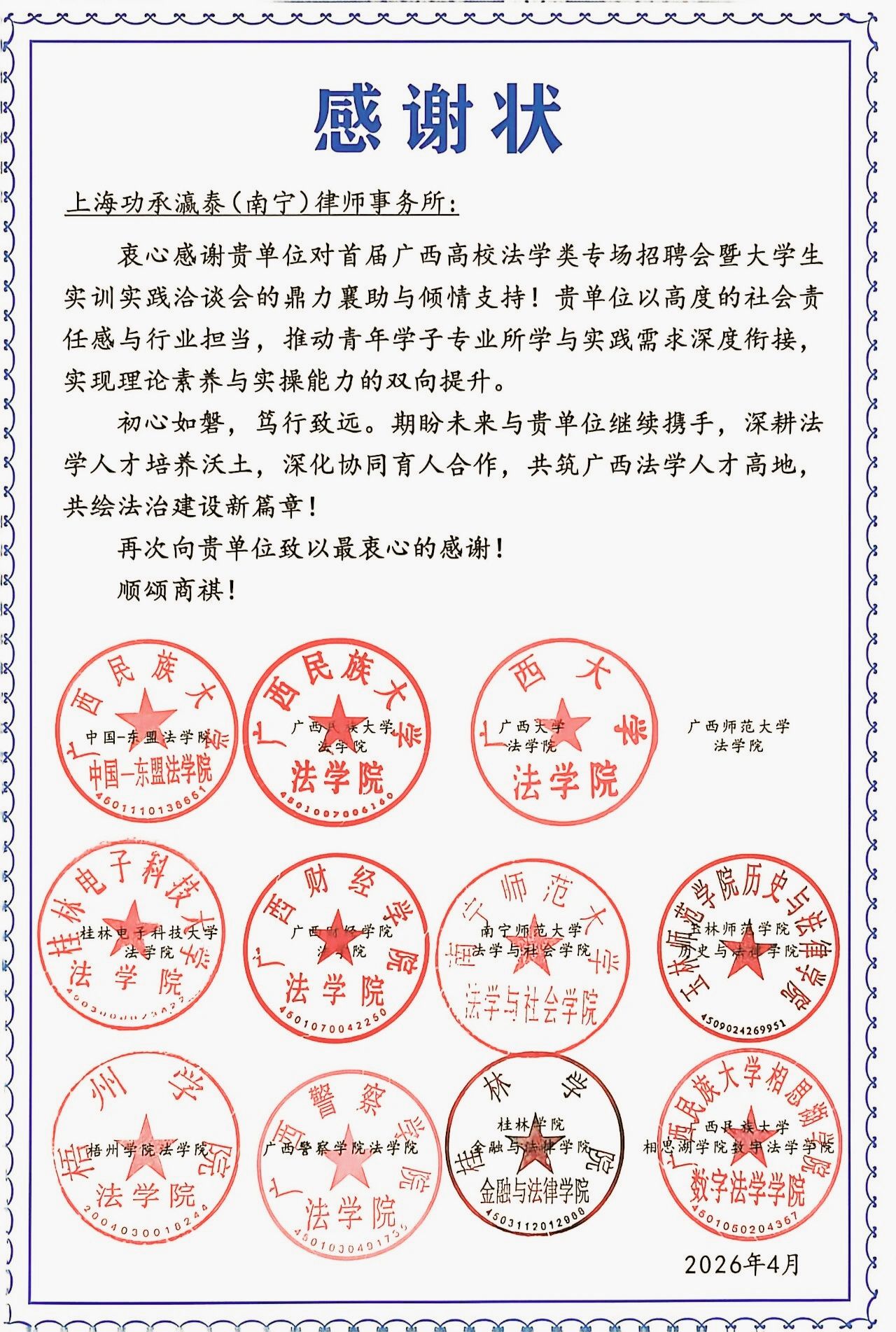 启动仪式上,中国—东盟法学院执行院长、广西民族大学法学院院长陈星致辞,指出本次招聘会搭建了“十百千”校地精准对接平台,为法学专业学生提供了优质就业与实训实践机会。我院党总支副书记作为高校代表,为参会用人单位颁发感谢状,致谢各单位对高校法学人才培养与毕业生就业工作的鼎力支持。