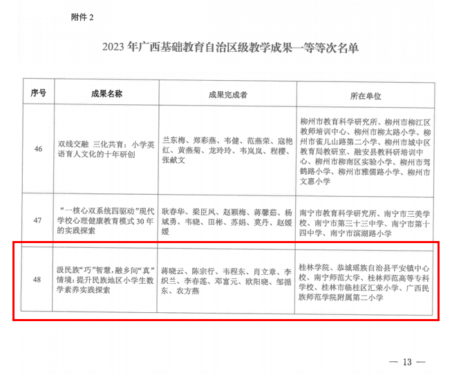 近日,《自治区教育厅关于公布2023年广西基础教育自治区级教学成果等次评定结果的通知》(桂教基教〔2024〕23号)文件公布了2023年广西基础教育自治区级教学成果等次评定结果,我校蒋晓云教授主持的基础教育教学成果《汲民族“巧”智慧,融乡间“真”情境:提升民族地区小学生数学素养实践探索》荣获一等等次,这是学校“十四五”期间获得的重要标志性成果之一。