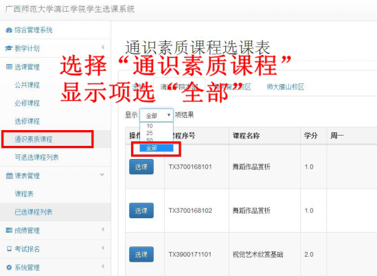 (三)点选择“通识素质课程”,显示项选“全部”;