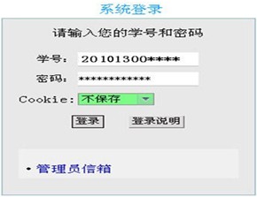 1.在系统登录的对话框中输入学号和密码,首次登录密码与学号相同。Cookie处请选择不保存。如图所示: