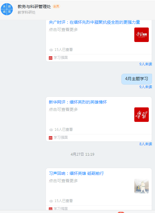 4月27-28日,根据校党委的总体学习计划,教科处支部结合学习主题和工作实际。首次,尝试通过钉钉和学习强国APP结合的学习方式开展党员活动。做到了整体活动过程有记录,个人学习有效果。通过网上在线学习的形式,进一步增加了同志们在工作中,灵活使用网络办公平台和学习强国APP的习惯,为下一步适应在防疫中复工复学的常态化工作生活模式打下坚实的基础。