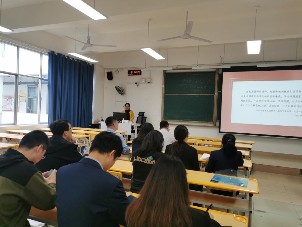 接着,支部组织委员钟英带领大家学习了《专题摘编》第九部分《坚持全面依法治国》的具体内容。钟英老师结合图文并茂的PPT从“为什么要全面推进依法治国”和“如何理解全面依法治国的总目标”两个方面对相关内容作了详细的讲解。整个领学过程讲授条理清晰、内容深入人心,让在场全体党员获益。