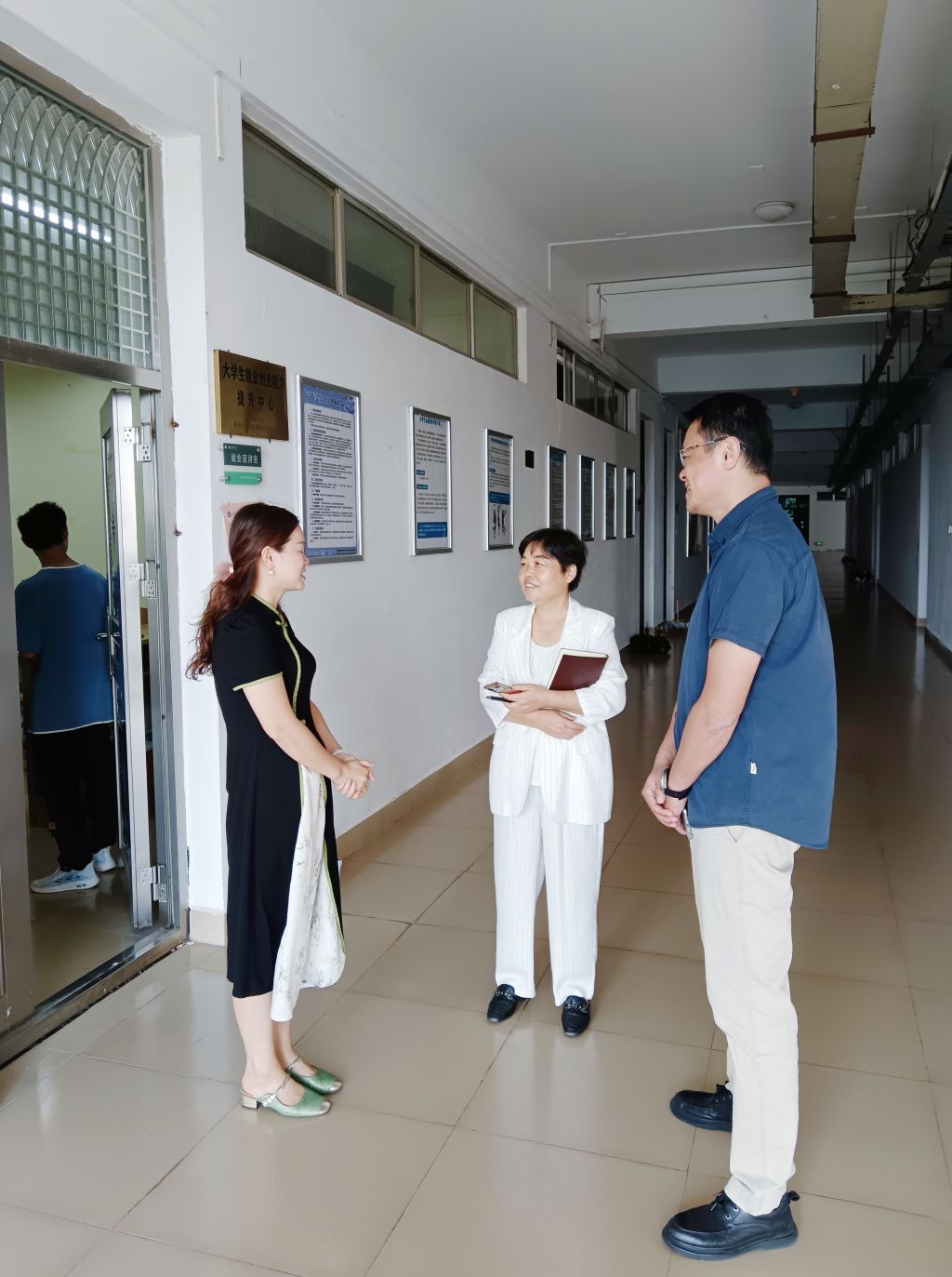 副校长何玲(中间)、教务与产教融合处杨杰夫(右一)与培训老师黄梅(左一)课前交流