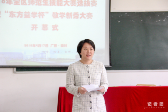 随后,本次比赛的合办方广西东方益学教育集团副总裁陆宝仕女士致辞。她对我校师生在全区师范生教学技能大赛中取得的成绩表示赞赏,希望通过双方共同举办比赛培养师范生教学能力,提升教学水平,为广西基础教育事业和公司未来发展储备更多优秀人才。她表示,未来两年,公司将同我校深入合作,通过引入教育培训行业的资源为广大师范生提供教师职业资格考试、教师入编入职考试提供更全方位的支持。