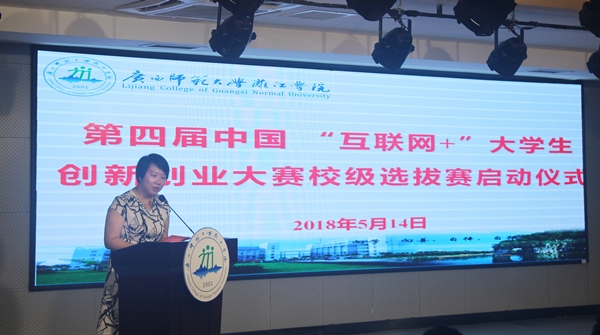 5月14日上午,为学习贯彻习近平新时代中国特色社会主义思想和党的十九大精神,落实习近平总书记给第三届大赛“青年红色筑梦之旅”大学生重要回信精神,落实自治区教育厅《关于举办第四届中国“互联网+”大学生创新创业大赛广西赛区选拔赛的通知》(桂教高教〔2018〕17号)文件相关要求,进一步激发我校学生创新创业热情,展示我校创新创业教育成果,我校在至善讲堂举行第四届中国“互联网+”大学生创新创业大赛校级选拔赛启动仪式。校领导杨树喆、邓志平、章冬兰、杨庆庆出席会议;广西师范大学创新创业学院副院长蒙志明,我校2016届校友、桂林市威尔尼斯健身有限公司兼广西起跑线健身服务有限公司执行CEO张峰,法学专业2017届校友、桂林舞汇文化传播有限公司董事长陈峥嵘等三位嘉宾应邀出席了本次活动;各系(部)主任、分管教学科研工作副主任、分管学生工作副书记,教务与科研管理处、学生事务部领导班子成员,校“四创”中心相关人员、创新创业教育教研室全体任课教师及申报团队指导老师及各系学生代表参加了会议,会议由杨庆庆副校长主持。