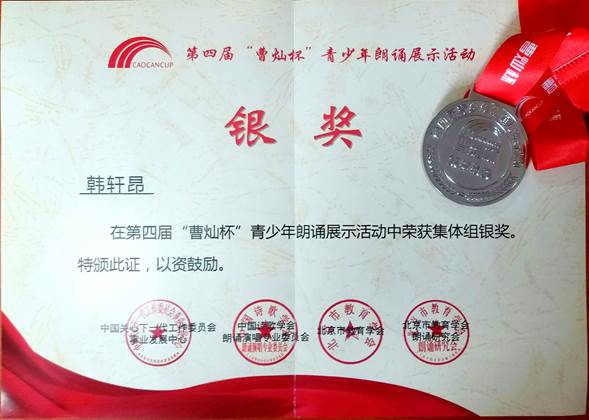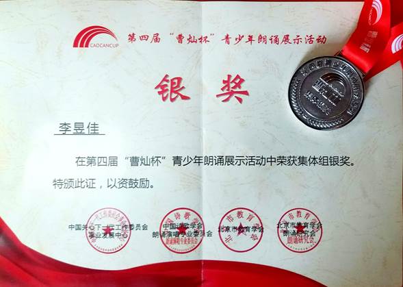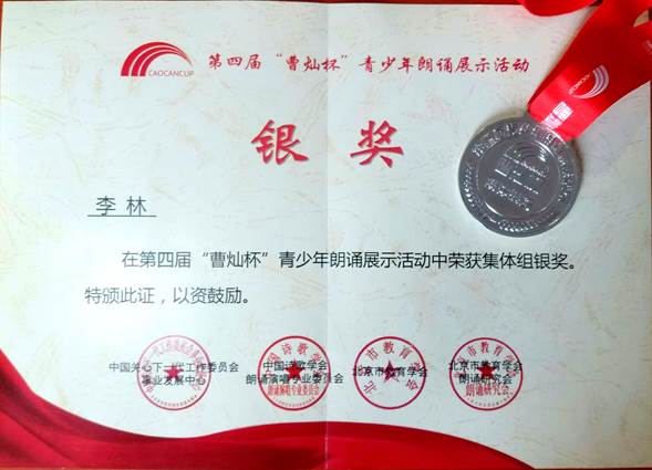 由中国关心下一代工作委员会事业发展中心、中国诗歌学会朗诵演唱专业委员会等单位联合主办的首届全球华语朗诵大赛暨第四届“曹灿杯”青少年朗诵展示活动全国终极展示中,我校选手组成的朗诵组在带队教师与指导教师的精心指导下,两次登台比拼,最终杀出重围,荣获集体组银奖,现予通报表彰。祝受表彰的集体和个人不断前进,再立新功;同时希望全校各单位与全体师生以获奖集体和个人为榜样,开拓创新,锐意进取,为不断塑造我校文化品牌而努力奋斗!