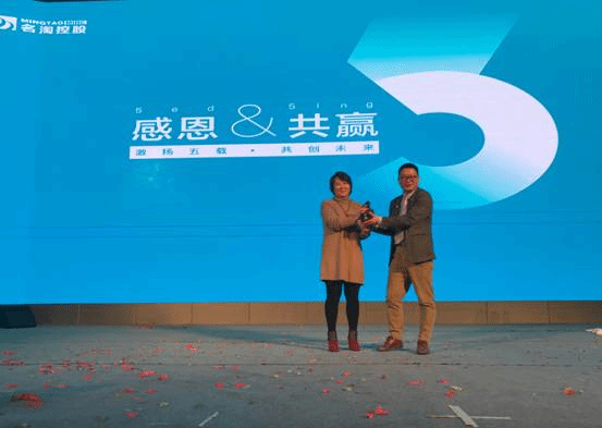 在名淘公司年会上,副校长杨庆庆与名淘公司副总经理江战代表双方互赠礼品,为校企双方2019年的合作开了好头!