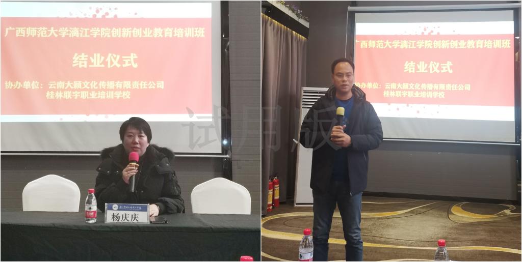 12月20至22日,由教学科研处、创新创业学院联合中国红色教育(传承)学会、桂林联宇教育公司共同举办的中国红色教育学会广西创新创业教育培训班(桂林站)暨广西师范大学漓江学院创新创业教育培训班在桂林市金色家族酒店会议中心举行。学校党委副书记、纪委书记、副校长邓志平,副校长杨庆庆和各学生工作部、校团委相关领导,各二级学院分管创新创业副书记、分管教学副院长,创新创业教育教研室全体教师近60人参加了本次培训班。